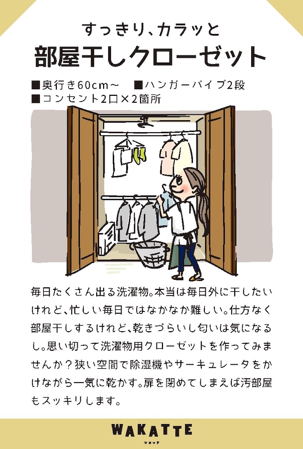 また、部屋干しクローゼットをつくるのもおすすめです。内部にコンセントをつけて除湿機やサーキュレーターを回せばすぐに乾き、来客時には扉を閉めて隠すこともできます。