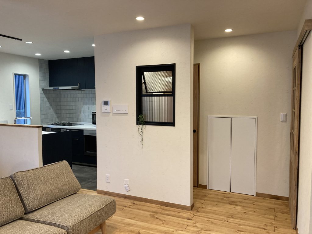 エコカラットの隣はトイレ。リビングの中にあるトイレですが、壁があるのでトイレへの出入りの際も視線が気になりません。この壁に室内窓が付いているので圧迫感がなく、おしゃれなアクセントになっていました。