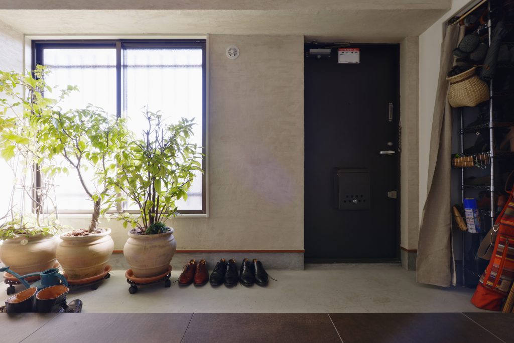 - 土間と廊下は左官仕上げ。リビングの無垢の扉との相性も抜群。