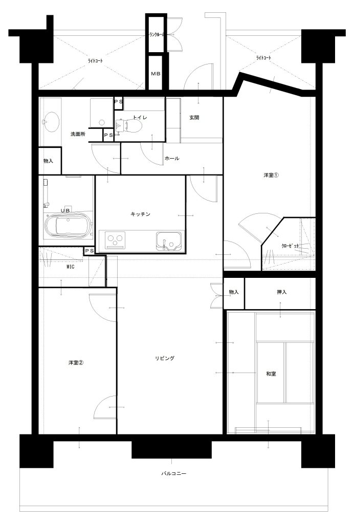 リビングの両隣にあった2部屋の間仕切り壁を撤去し、3LDK→1LDKに。リビングを広く開放的に使えるようにしました。あえて梁型をつくり、将来的にロールスクリーンなどで仕切れるように計画しています。