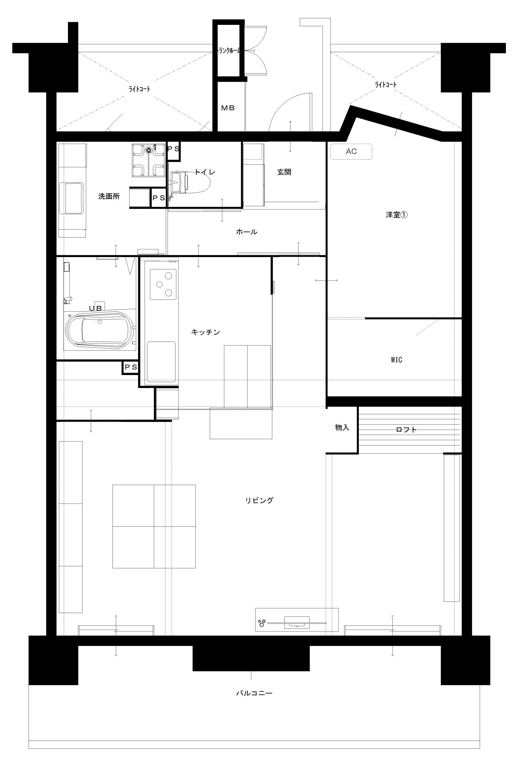 リビングの両隣にあった2部屋の間仕切り壁を撤去し、3LDK→1LDKに。リビングを広く開放的に使えるようにしました。あえて梁型をつくり、将来的にロールスクリーンなどで仕切れるように計画しています。