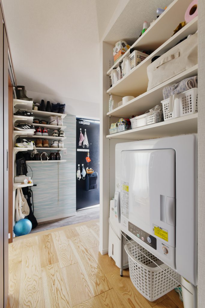 以前の住まいでも使っていた衣類乾燥機。床置きにするとお子さまも手伝ってくれるというお話しから、廊下に設置できるスペースを作りました。乾燥した衣類は向かいの部屋の収納スペースへしまえるよう洗濯動線に配慮しました。