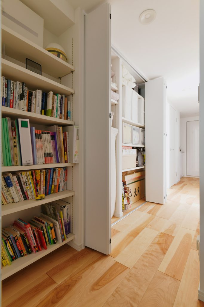 以前の間取りでは、収納スペースが家の中に分散しており、使いたいものを使いたい場所にしまえないのが悩みでした。そのため、個室には収納を作らず、廊下の壁面を全面収納にして、バックヤードのように使える形にしました。ウォークインクローゼットは、個室の中にあったものを、廊下から直接出入りできる設計にしたことで、家族みんなが使いやすい作りに。また、建具を白で統一することで、壁面収納は大容量でも扉を閉めた時にはすっきりとした印象。子ども関連のおもちゃや洋服はリビングの収納にまとまっており、一か所で完結できるためとてもスムーズです。