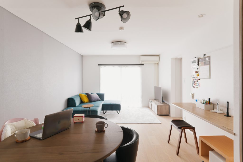 キッチンとダイニングを仕切るドアを取っ払ったことで、廊下を抜けるとリビングの奥まで見通せて、視界的にも広々としています。リビングの一角には、壁付けのワークスペースを。将来は、子どものスタディスペースになる予定です。壁がマグネットボードになっているので、仕事、学校、習い事、など、家族で必要な情報を共有できる場にもなっています。物が集まりやすいリビングの収納スペースは、細々としたものから大きなものまで、必要に応じて形を変えられる可動棚を採用。扉を浮かせることでルンバ基地にもなっています。