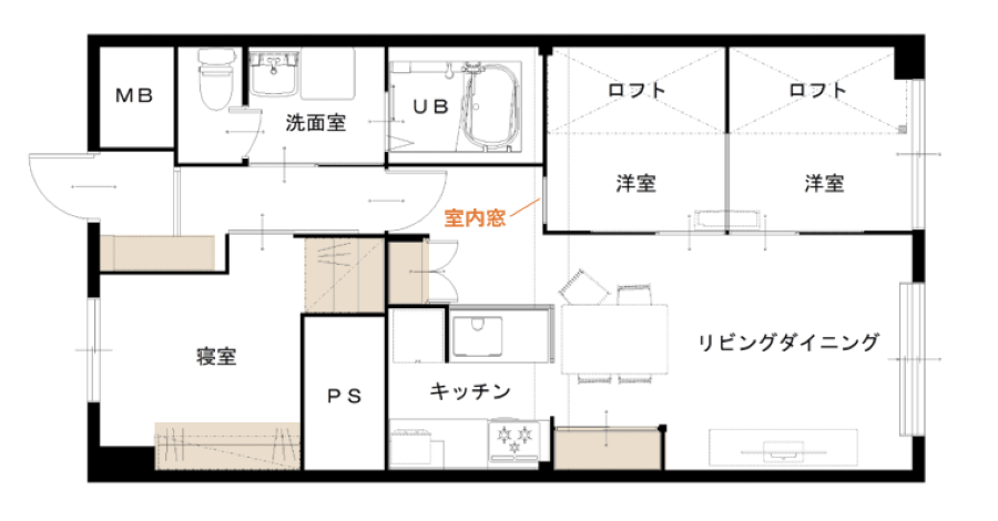 • リビング、ダイニング、キッチンと縦につながる間取りへ。限られた空間ですが、縦長の目線で視覚的に広がりを作りました。