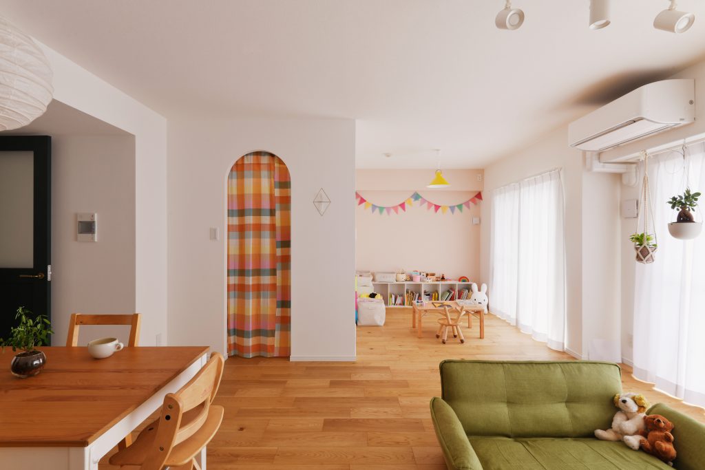こだわりのファミリークローゼットの入り口は、目を引くかわいらしいアーチ形。オレンジのチェックのカーテンがリビングを明るく彩っています。リビングドアはグリーンに。深い緑色がアクセントになっています。リビングの壁には、子どもの作品やアートなどをさりげなく飾れるようにクロスの下にマグネットを入れています。洗面室、WIC、プレイスペースには淡い色合いのアクセントクロスを採用し、カラフルでやさしい空間を演出しています。
