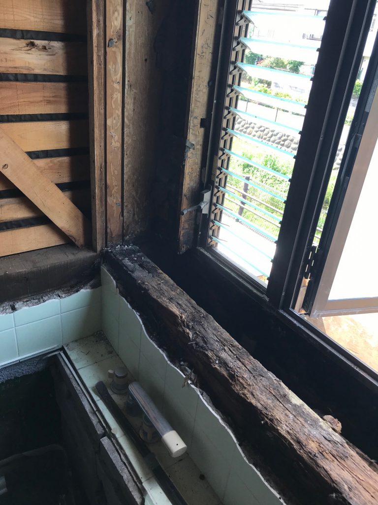 浴室を解体したら土台や脱衣場のベニヤ板が腐食していたため木部入れ替えが必要になった