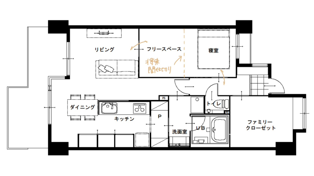 将来、子ども部屋を2つ確保することを想定した間取りを考えました。個室は2つあり、今は家族の寝室として使っている1部屋が、娘さんのお部屋になる予定。奥様のワークスペースが寝室の隣にあるので、寝かしつけの後もお子さんの様子が感じられるので安心です。将来、下の息子さんに部屋が必要となった時は、リビングの間仕切りの奥を夫婦の寝室にする予定です。