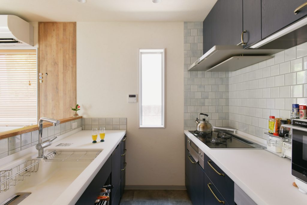 限られた広さでも、目線の先に視界が抜ける窓を設置することで視覚的な余裕が生まれます。キッチンに立った時、視界の向こうに庭が広がっているのでとっても開放的。また、ウッドデッキも段差がなくフラットな高さなので、リビングの一部のような広がりが感じられます。今回、吊り棚を設置せず、視界をすっきりとさせたことも、視覚的な広さを感じさせる秘訣。場所を取るダイニングテーブルには、圧迫感が少ない丸テーブルをチョイスしました。
