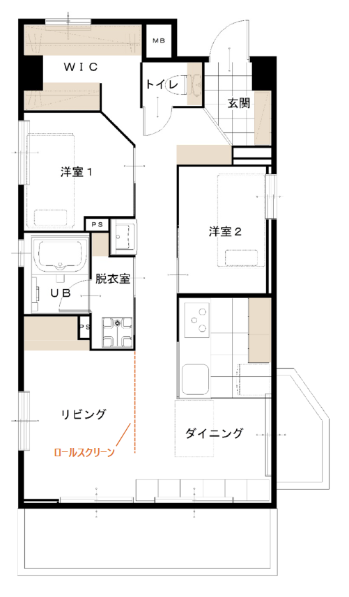 Dさまのおうちはとても日当たりの良い角部屋。大きな窓からの光が活きるように、リビングの隣にあった洋室との仕切りを取っ払って、LDKを広々と使えるようにしました。この空間をロールスクリーンで仕切ることで、暮らしの境界線をフレキシブルに変化させることができます。昼は仕事のスペースとして。夜は夫婦の寝室として。休みの日は家族のくつろぐスペースとして——。実はこのロールスクリーン、プロジェクターのスクリーンにもなるタイプ。「家族みんなで映画を見るのが好き」というDさまにぴったりの環境が整いました。ご主人が大切にされている観葉植物にも定位置を。水に強い床材を使うことで、室内でも気兼ねなく植物のお世話ができます。