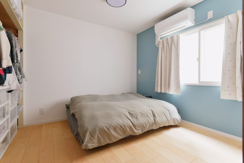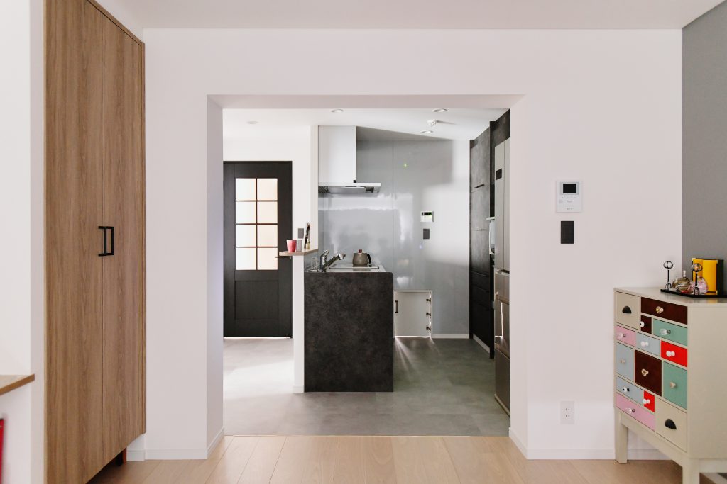 1DKのマンションの2部屋をつなげて、家族4人が生活できる2LDKの間取りに。さまざまな建築上の制約がある中でも、暮らしやすい生活動線を確保できるプランを提案しました。キッチンはコンパクトなI型ですが、通路を広めに取ることで移動がスムーズになり家事効率がアップ。玄関は土間部分を広げ、収納スペースをたっぷり取ることで、ベビーカーを置いても余裕があります。子どもの外遊びの道具も気兼ねなくしまうことができます。奥様の提案で作った玄関とキッチンを繋ぐ小窓は、宅配便などの荷物を部屋まで運ぶのにとても便利です。