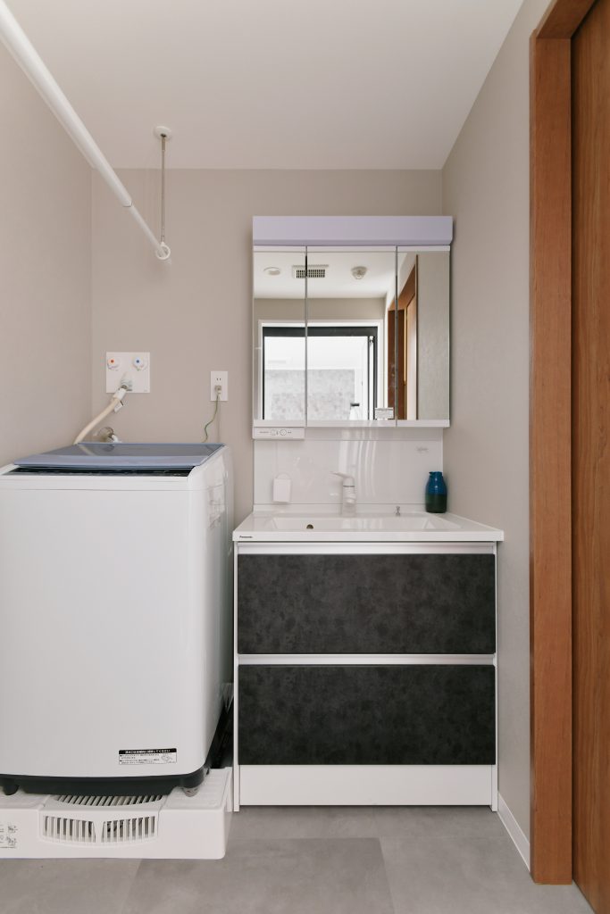 壁紙や床材は、インテリア好きのご夫婦が、色味から素材まで時間をかけてセレクトしました。玄関から廊下、キッチン、洗面所のエリアには、水に強く傷がつきにくいフロアタイルを採用。シックなグレートーンで落ち着いた雰囲気になっています。リビングには、淡いグレー木目のフローリングと、鮮やかなグリーンのソファが映えるアクセントクロスを。お気に入りのインテリアに囲まれる居心地の良さを日々感じているそうです。