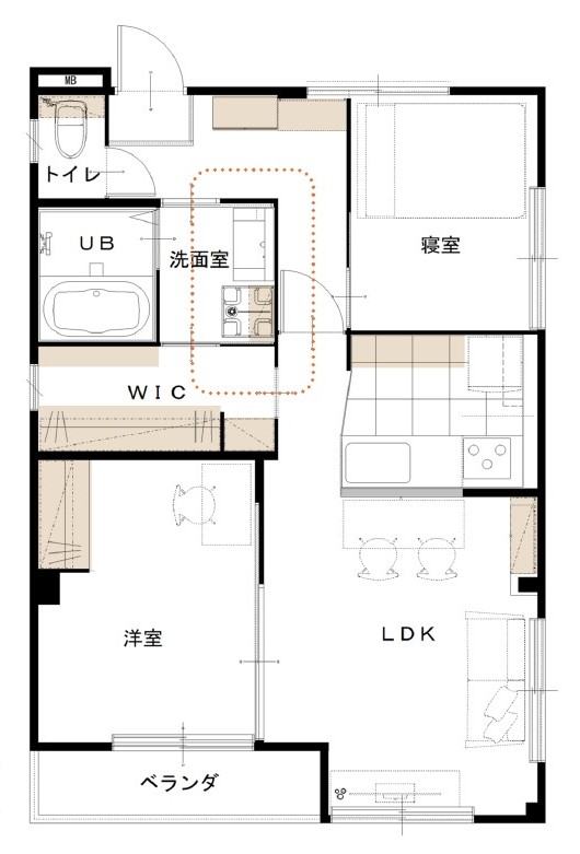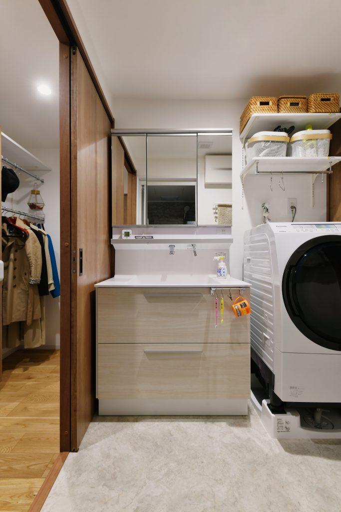 洗面室は玄関側とWIC側、2か所にドアがあり、ウォークスルーできるようになっています。「洗面室」「WIC」「キッチン」の動線が1本につながることで、洗濯したものをWICにしまったり、洗濯機を回しながらキッチンへ移動したり、という家事がとっても楽に。玄関近くに洗面台があるので、家に帰ってすぐ手を洗えるのも安心です。