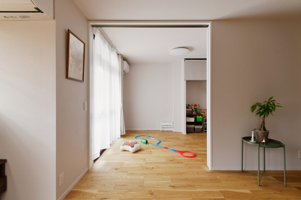 もともと和室だった空間を、リビングにつづく洋室に。今は、お子さまのプレイスペースやTさまのテレワークスペースとして。仕切れば客間にもなり、お子さんが成長すれば子ども部屋にも。リビングと洋室の間には、天井いっぱいの高さがある上吊りの引き戸を採用しているので、床のフローリングには仕切りがなく、ドアを空けておくと視覚的にも広さを感じられます。