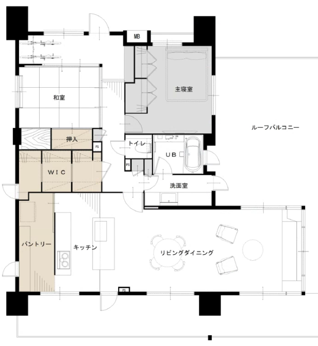 マンションの最上階。広いルーフバルコニー。窓から見えるパノラマの風景。そしてF様のお気に入りの家具たち。それぞれの魅力を生かし引き立て合う、そんなリノベーション。理想の暮らしを、じっくりと時間をかけて作り上げました。家全体の持つ、朝・昼・夜、それぞれの表情が暮らしを演出しています。