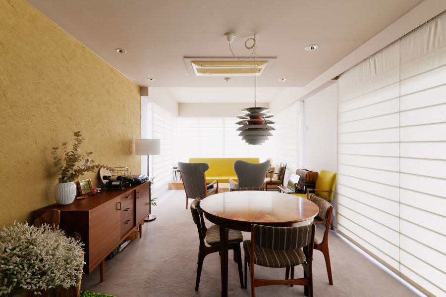 お二人が大切に使ってきたヴィンテージの家具ひとつひとつが映えるように、クロスやカーペットはグレーを基調にして、背景に色のコントラストが出ないようにしました。さまざまなデザインのチェア、テーブル、キャビネット、照明、そして造作のソファーが、落ち着いた暮らしになじんでいます。
