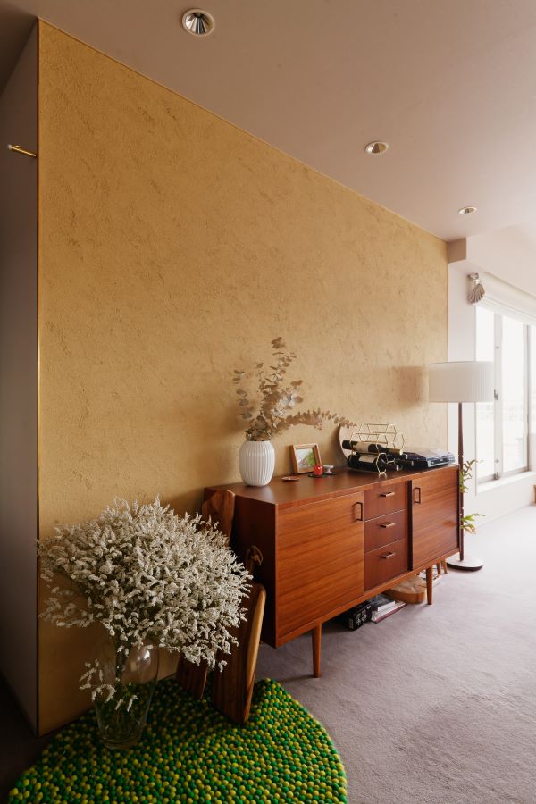 お気に入りの家具を引き立てる背景のように計算された内装。それでいて、使われている素材一つ一つにもストーリーがあり、落ち着いたF様も暮らしにしっくりとなじんでいます。手すき和紙のふすま紙や土壁など、職人さんの手仕事が感じられる上質な空間は、トレンドに流されない時代を越えた心地よさを感じさせてくれます。