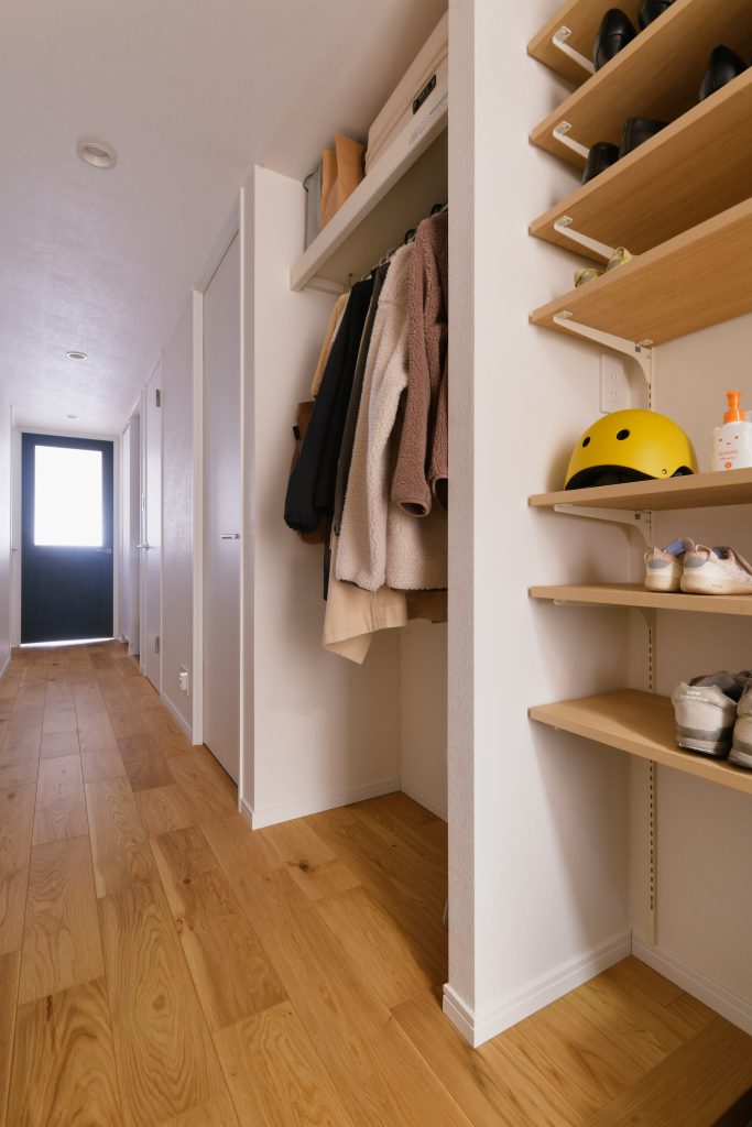 玄関は可動棚を利用したオープン収納。土間部分が広がり、ベビーカーをそのまま置くことができるようになりました。靴箱の扉を開ける手間がないので、脱いだら棚に置く、という片づけ習慣が自然に身に着き、これまではしまい込んでいた靴も目に触れることで履く機会も増えたそうです。既存の収納を活かして、コート掛けも作りました。