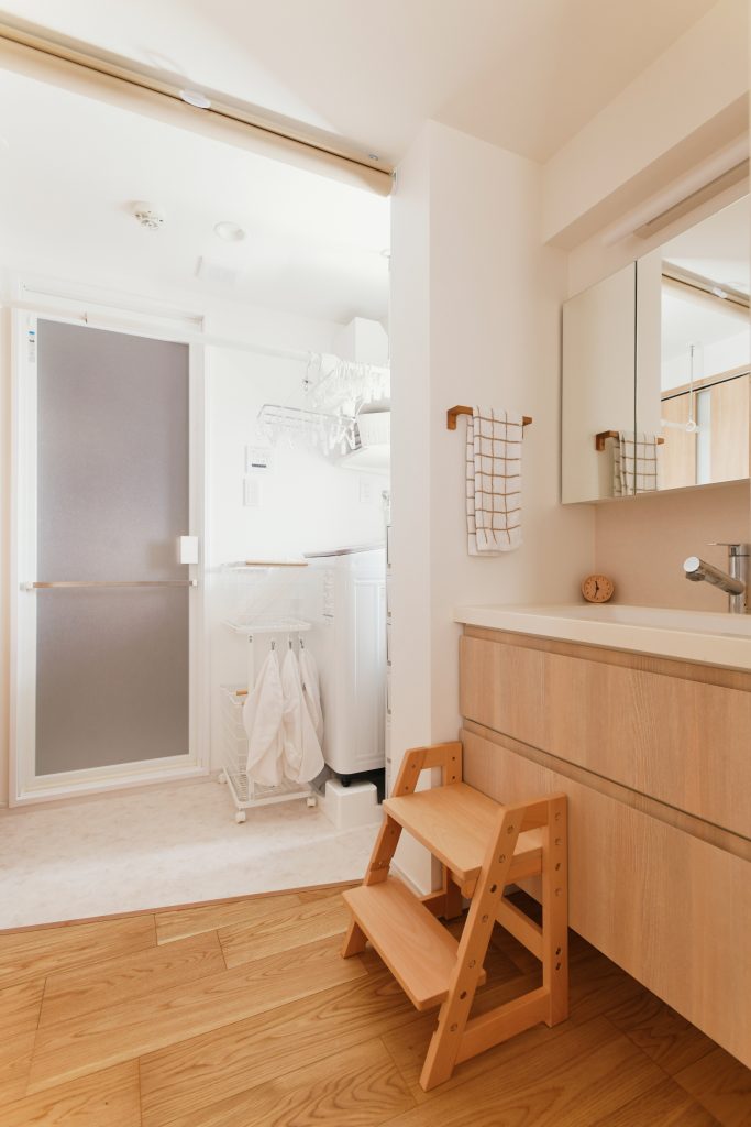 水回りの場所は大きく変えられなかったため、家の真ん中にあるお風呂をサイズアップして、脱衣室と洗面スペースを確保。キッチンは、壁付けにして、機能と収納を重視。冷蔵庫や家電、ストックをしまうためのパントリーをつくりました。