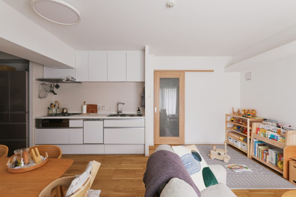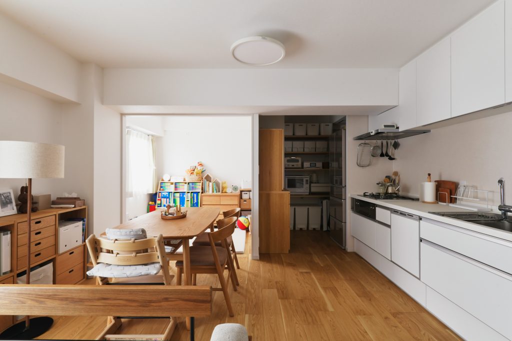 一般的なマンションとは少し異なる間取りですが、暮らしの動線はしっかり確保されています。お子さんも、リビング、洗面所、廊下、寝室、ウォークスルークロゼットを通過して奥の部屋へ行き、またリビングまで戻ってくるなど、家の中をぐるぐると探検して楽しんでいるそうです。整理整頓が上手で、お気に入りの家具なども上手に暮らしに取り入れているS様。キッチンの奥にあるパントリーも上手に活用し、お気に入りの食器棚を置くことも叶いました。お気に入りが映える家。これからどんな暮らしになっていくのか楽しみです。