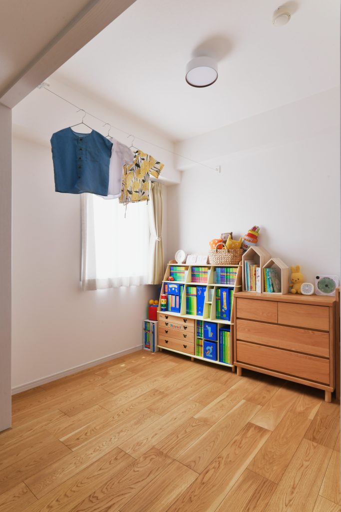壁がなく、正方形に近い間取りって、実は散らかりやすいんです。リビングとしっかりエリア分けをすることで、おもちゃを広げても、室内干しをしても、お子さんの体調が悪いときはお布団を敷いても・・・小学生になったら、机を置いて学習スペースになる予定。リビングから目の届くところだけど見え過ぎない、ママにやさしいスペースです。