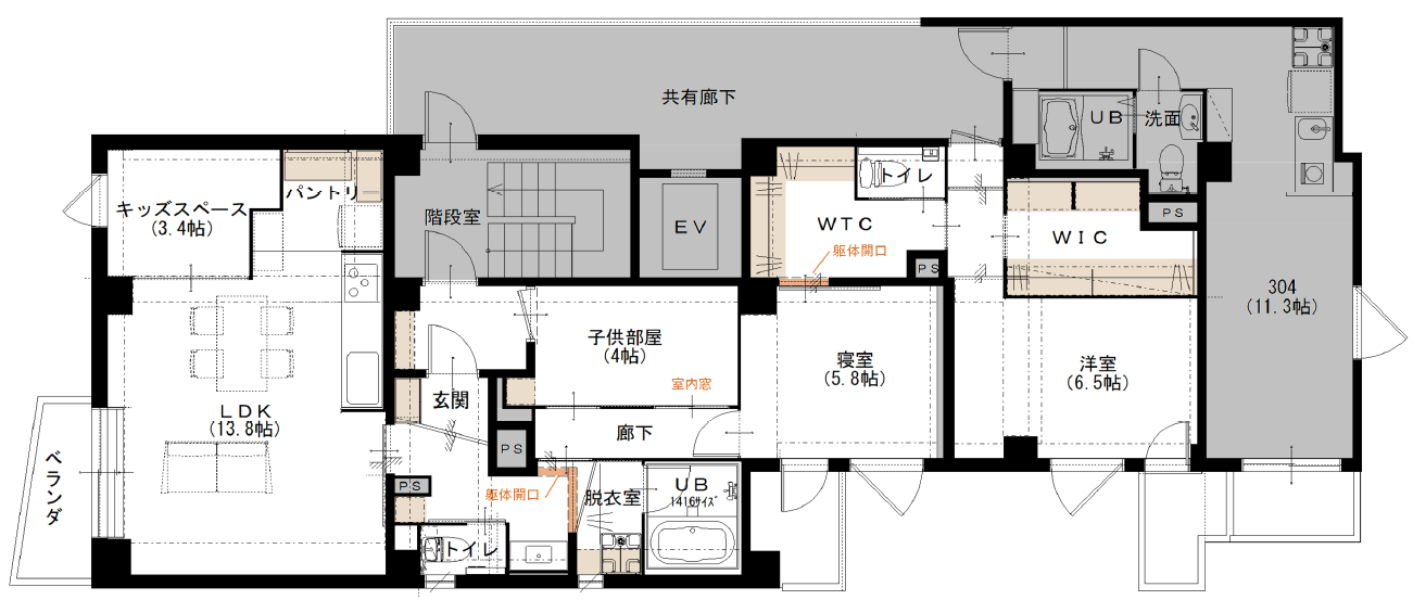 一番日当たりの良い部屋は、家族が集まるLDKに。梁に区切られた奥のスペースは、LDKに取り込むこともできましたが、あえてキッズスペースとパントリーをつくりました。