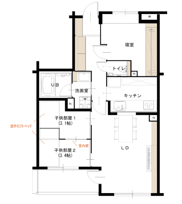 2LDK、56㎡のマンション。2人のお子さんが小学生になり、手狭になってきたことでリノベーション。壁式構造のため、大きく間取りを変えることはできないけれど、これからの暮らしに合わせて持ち物を見直し、生活空間を広く使うための収納を設計。また、ロフトベッドなどを取り入れて子ども部屋をつくるなど、コンパクトな家でも快適に暮らす工夫がたっぷりつまっています。