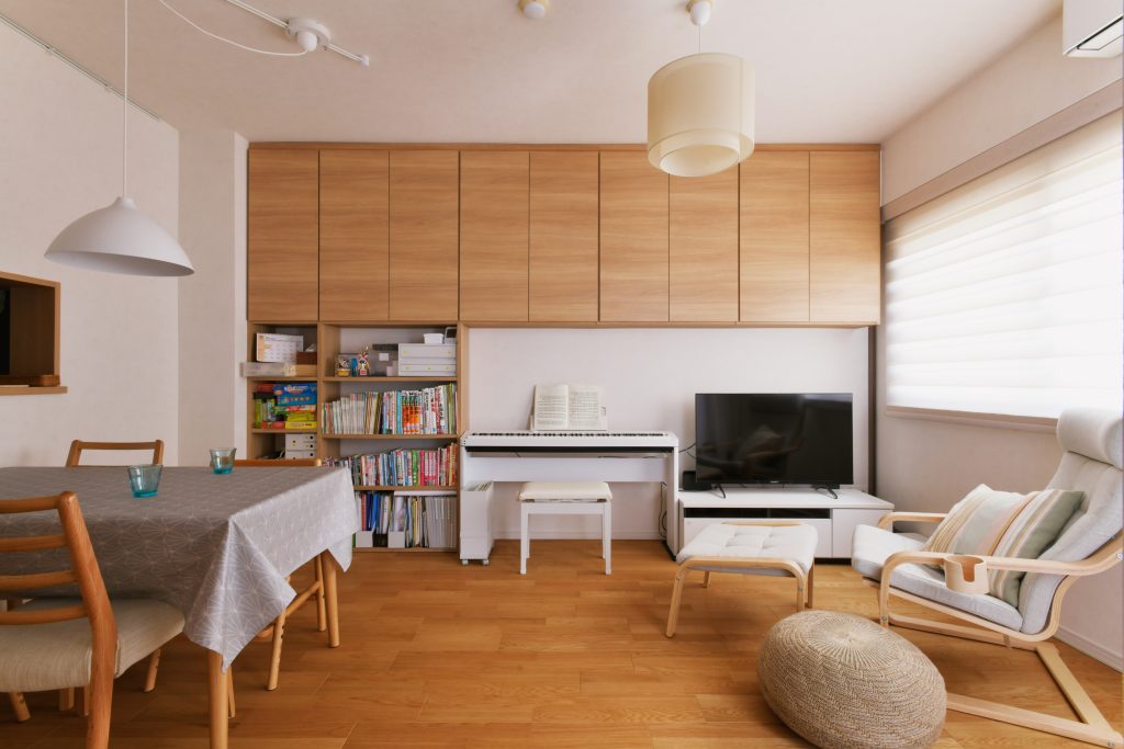 収納にも、コンパクトな家ならではの工夫があります。リビングは、ピアノとテレビのサイズに合わせた壁面収納に。吊戸棚で上のほうに収納を持ってくることで、圧迫感を感じにくくなります。ご夫婦の寝室は、作り付けのクローゼットを取っ払いオープン収納に。部屋が広く使え、布団の出し入れも楽になりました。