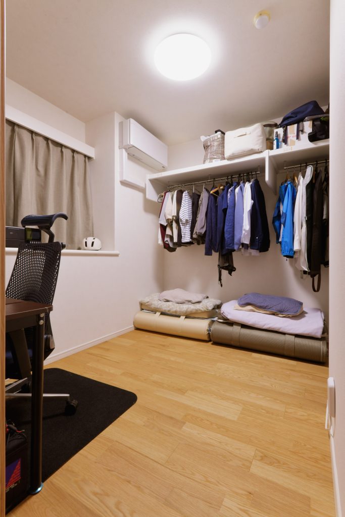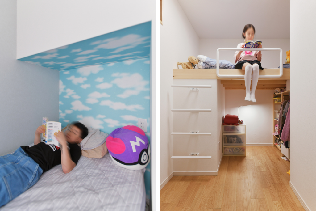 リビングの隣、以前は和室だったところを2人それぞれの子ども部屋に。お姉さんの部屋はロフトベッドになっており、ベッドの下の空間が広く使えます。外窓はありませんが室内窓を設置して奥行きや抜け感を。ベランダに面した弟さんの部屋は、ベッドを置く場所を決めて部屋の形を設計したことで、特別な「こもれる空間」が生まれました。青空のクロスは息子さんのチョイス。それぞれにエアコンを設置して過ごしやすさも大切に。どちらも、世界に一つだけの子ども部屋です。