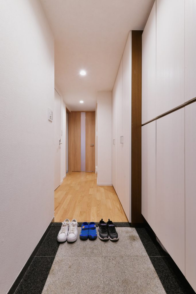 既存はウォールナット系のドアやフローリングでしたが、明るい色を基調としたことで、広く見えるようになりました。玄関、廊下の天井まである収納棚は扉だけを交換。圧迫感がなくなりすっきりとした明るい印象になりました。壁構造のため大きな間取り変更はできませんでしたが、インテリアを変えることで印象が変わり、統一感や広さを感じることができます。