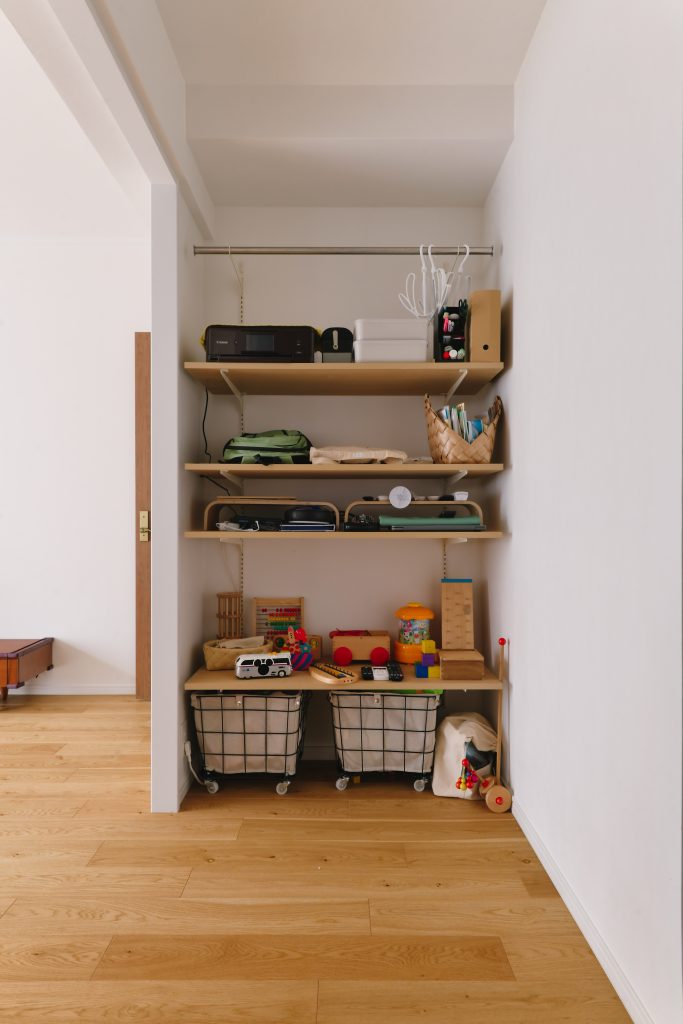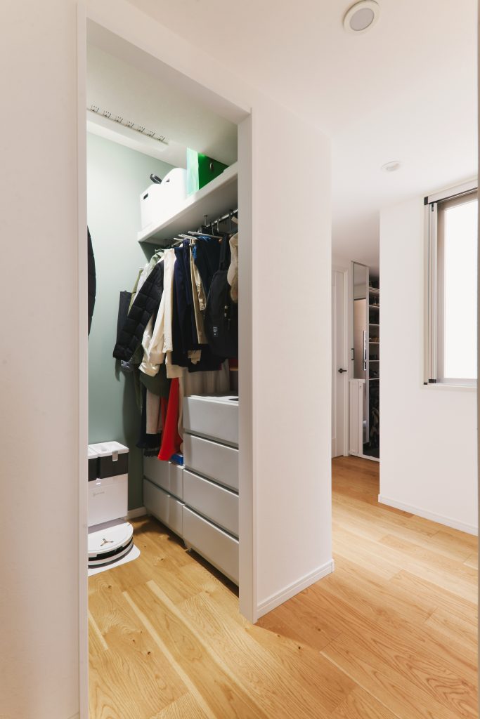 F様のお家にはWICが2つあります。ひとつは、家族4人の寝室の近く、廊下からも直接出入りできる共有のWIC。もうひとつは、リビングとつながるキッズスペースの奥にある、かつて押入れがあったスペースを活用したWIC。