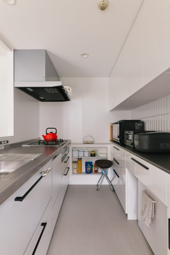 ステンレスとホワイトを基調としてまとめたキッチンとカップボードは、実は同じメーカーでグレードを変えています。デザインを損なわない、コストバランスがポイントです。