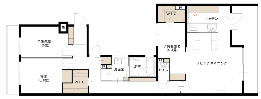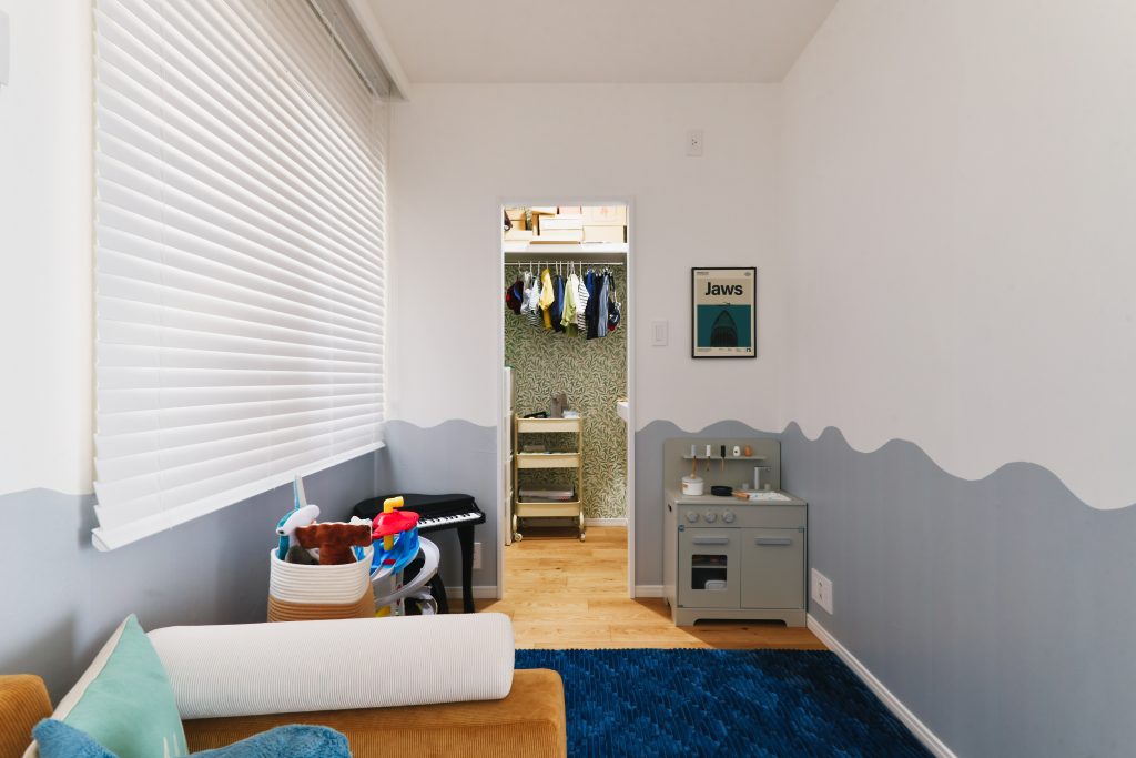 現在の4人の寝室は、将来子ども部屋になる予定。そして、現在のキッズスペースは夫婦の寝室に。住みながら使い方を変えていく中で、WICの役割も変化します。形はそのままでも、ライフステージの変化に伴ってフレキシブルに対応できる間取りを提案しました。